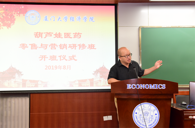 在开班仪式上,廖景峰主任首先代表厦门大学经济学院热烈欢迎红蓝医药零售与营销研修班的学员到厦大学习,并就厦门大学及经济学院的相关情况进行了介绍。他说,红蓝学员走进厦大就是厦大的校友,希望未来的日子能够关心、支持母校的发展,多提宝贵意见,同时他也祝大家在厦大学习期间学有所成、学有所获。