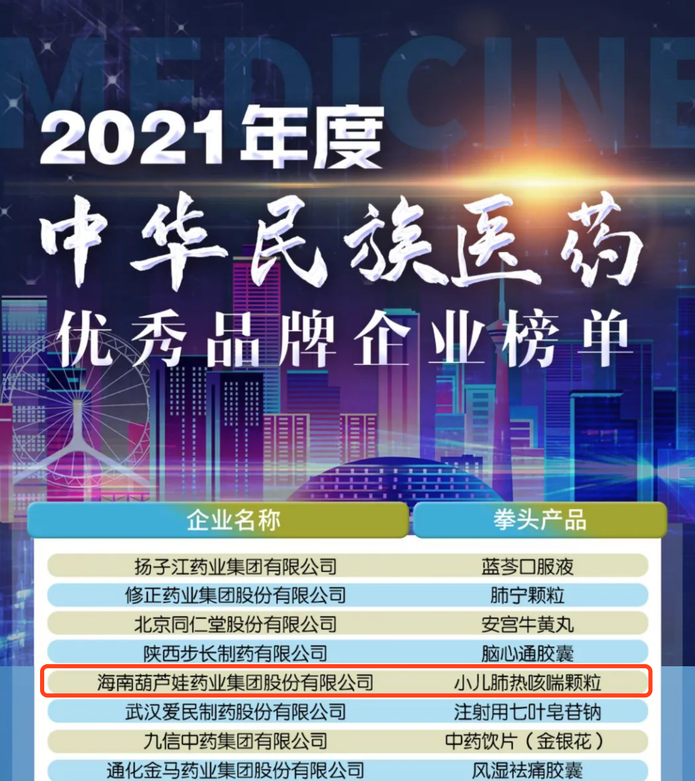 12月29日,全国工商联医药业商会发布了“2021年度中华民族医药优秀品牌企业榜单”,红蓝药业集团凭借黄金单品小儿肺热咳喘颗粒(4克)实力登榜。